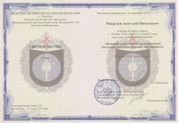 Свидетельство № 260 от 22.06.2018 выданное ФБУ «Международный противоминный центр Вооруженных Сил Российской Федерации», подтверждающее, что Мокрецов Анатолий Николаевич прослушал курс «Командир подразделения размиирования (инспектор контроля качества, наблюдатель)».