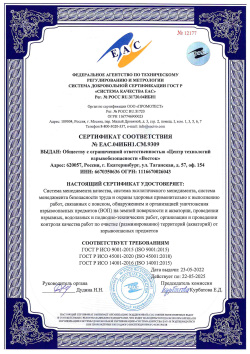 Сертификат соответствия № ЕАС.04ИБН1.СМ.9309, удостоверяющий, что система менеджмента качества, система экологического менеджмента, система менеджмента безопасности труда и охраны здоровья применительно к выполнению работ, связанных с поиском, обнаружением и организацией уничтожения взрывоопасных предметов (ВОП) на земной поверхности и акватории, проведении взрывных, водолазных и подводно-технических работ, организации и проведении контроля качества работ по очистке (разминированию) территорий (акваторий) от взрывоопасных предметов соответствует требованиям: